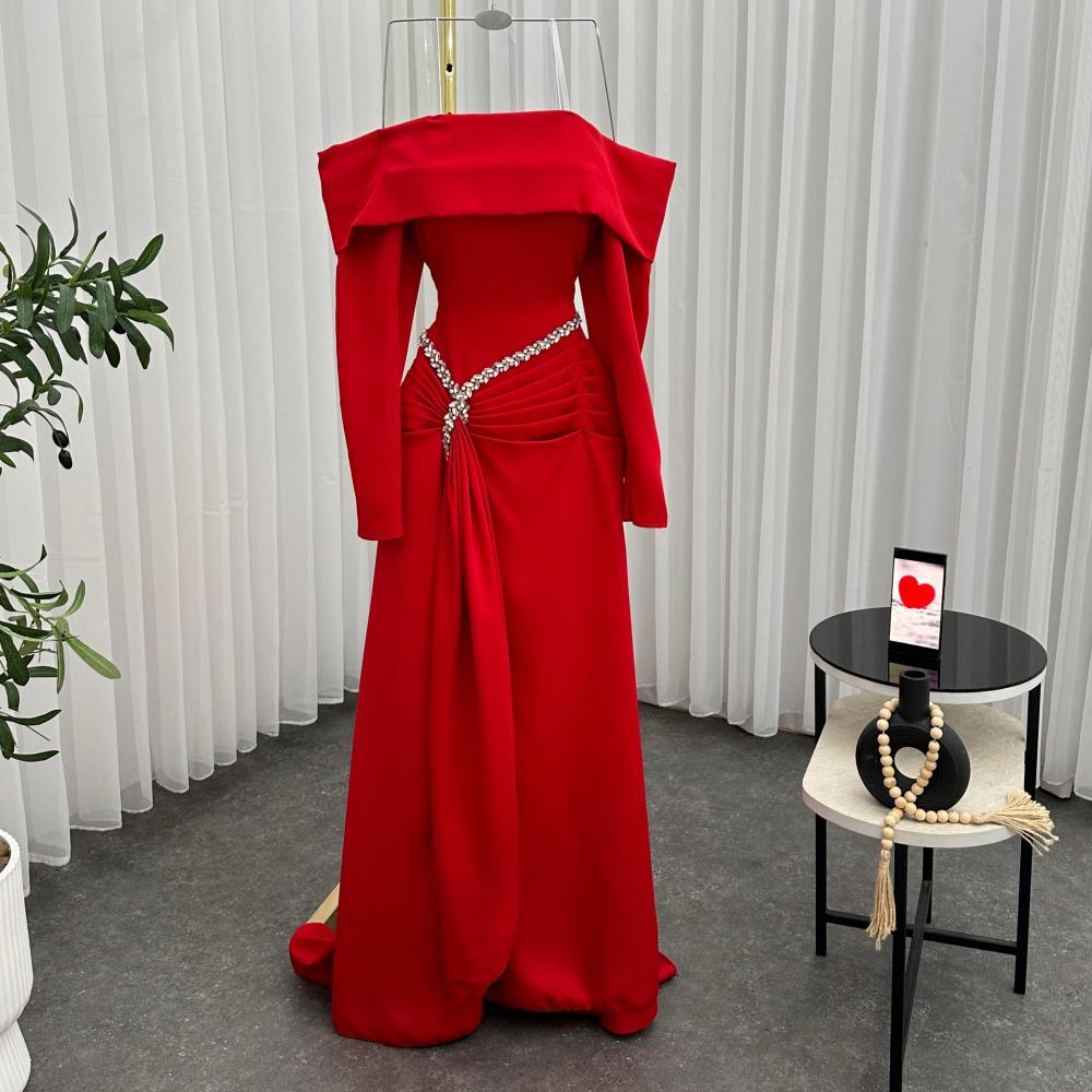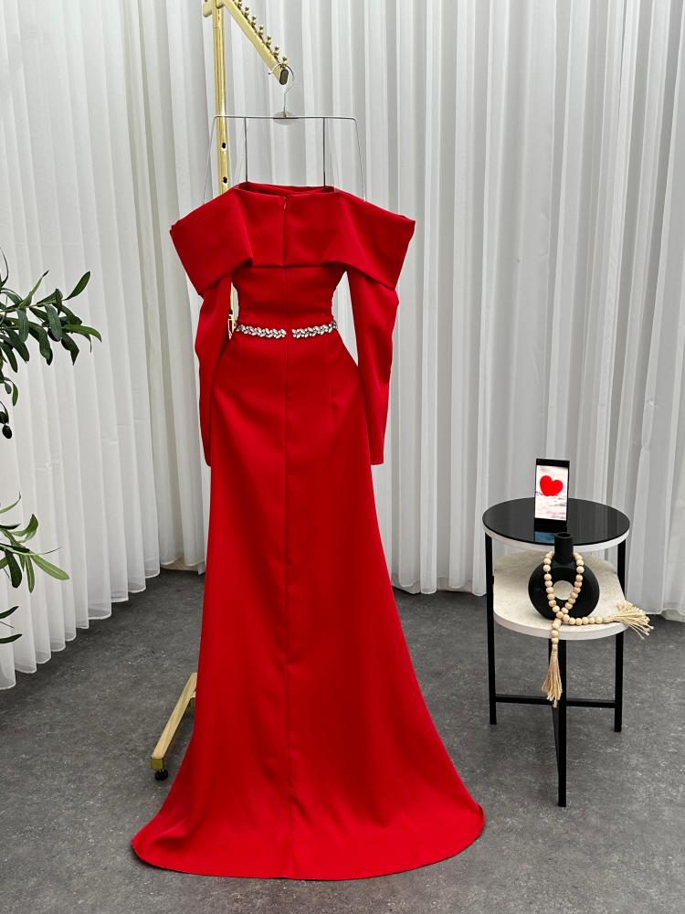 فستان سهرة أصفر فاتح أنيق و لون احمر، بتصميم أوف شولدر وأكمام طويلة، يتميز بقصة حورية البحر مع تفصيل لامع عند الخصر وتكسيرات جانبية تضفي حجمًا وذيلًا انسيابيًا، مما يبرز الأنوثة والفخامة.
